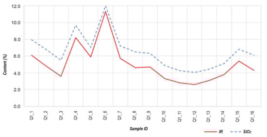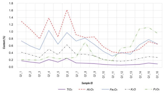 The XRF analyses for major oxides and the LOI are given in Table 3. LOI was <44%, the theoretical value for pure CaCO3. Samples Q1_4 and Q1_6, identified in the field as second-quality LGL (Table 2), have low CaCO3, whilst samples Q1_8 and Q1_9 have a CaCO3 content comparable to first-quality lithotype. A lower CaCO3 content is present in Q1_15. Burrow infills at the stratigraphic level from which Q1_8 was extracted had a similar CaCO3 content to first quality, while similar infills at the lithostratigraphic beds from which Q1_11 and Q1_14 were extracted had a similar CaCO3 content to second-quality lithotype [84], which indicates that burrowing activity introduced material different from the host rock.