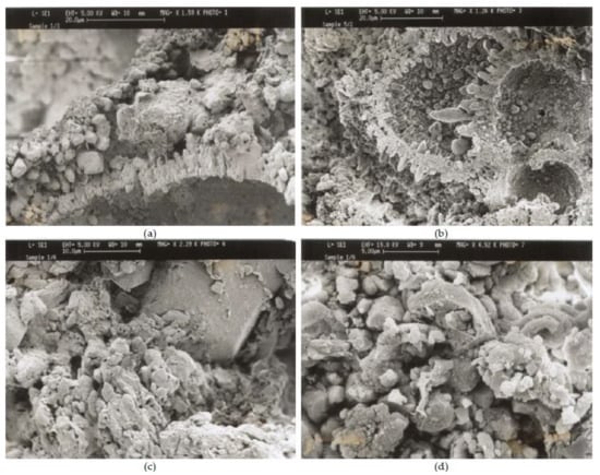 Three samples were analyzed through SEM: Q1_1 and Q1_6, first- and second-quality LGL, respectively, and a sample from the church. Microphotographs are given in Figure 12. The pore structure, the physico-mechanical interlocking and the fine-grained cement are shown in Figure 12a,b; fine-grained sparry calcite, which fills the inter-particle voids, cements most allochems. Although more samples are required for robust conclusive evidence, it is evident that the post-depositional, compact, low permeability LGL might have originally been very porous. The passage of water through the matrix encouraged the growth of the post-depositional interlocking calcite crystal fabric present in the church sample (Figure 12b). Such interlocking crystals provide a physico-mechanical bond which produces a more durable building stone.