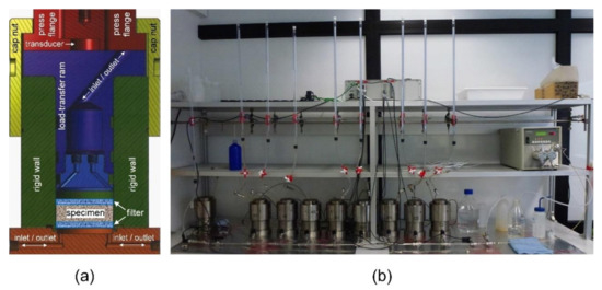 - Olsen, H.W.; Nichols, R.W.; Rice, T.L. Low gradient permeability measurements in a triaxial system. Geotechnique 1985, 35, 145–157. [Google Scholar] [CrossRef]