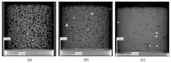 μCT images of 10X specimens compacted to dry densities of (a) 1.4 g/cm3; (b) 1.6 g/cm3; (c) 1.8 g/cm3.