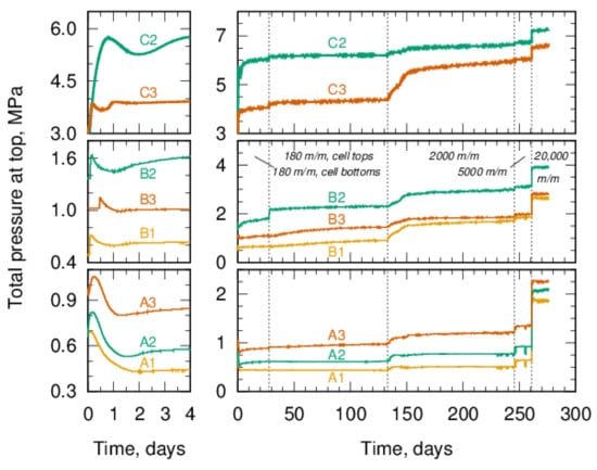 Total pressure at tops of permeameter cells for 10X specimens compacted to dry densities of 1.4 g/cm3 (cells A1–A3); 1.6 g/cm3 (cells B1–B3); and 1.8 g/cm3 (cells C2, C3), saturated and permeated by SGW. Graphs on left-side represent x- and y-axis close-ups of the data measured within the first four days of saturation. Vertical dotted lines mark onsets of solution supply by burettes through cell tops (28th day) and by the pump at hydraulic gradients of 2000 m/m (133rd day), 5000 m/m (246th day), and 20,000 m/m (261st day) (note that corresponding labels in the 2nd graph on right-side).