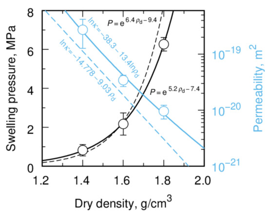 Swelling pressure and permeability (m2) of 10X specimens permeated by SGW as a function of dry density ρd. Circles and solid lines represent measured values and fitted curves of the present study, whereas dashed lines represent fitted curves of the study [4] (hydraulic conductivities reported in [4] were converted to permeabilities for the purpose of comparison).