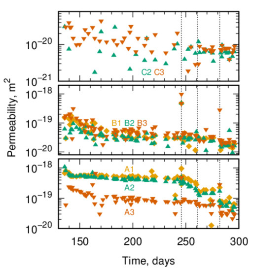 Permeability (m2) of 10X specimens compacted to dry densities of 1.4 g/cm3 (A1–A3); 1.6 g/cm3 (B1–B3); 1.8 g/cm3 (C2, C3), and permeated by SGW. Vertical dotted lines mark increases of hydraulic gradient to 5000 m/m (246th day); 20,000 m/m (261st day), and 80,000 m/m (281st day).