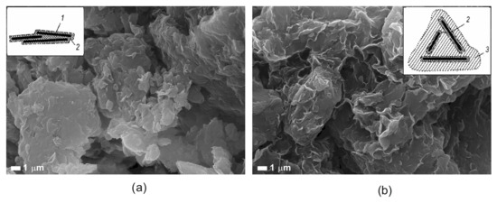 SEM images of the compacted 10X, fraction <0.25 mm, density 1.65 g/cm3, at 32,000×: (a) natural micro-aggregates of clay particles after an air-drying; (b) partially swelled micro-aggregate of clay particles. Sidebars on the top corners: structural model of clay swelling with different moisture (W) content: (a) W ≤ Wmg; (b) Wp < W < Wsw (Wmg—maximal hygroscopic moisture content; Wp—moisture of the plastic limit; Wsw—moisture of swelling). 1—clay particle; 2—adsorbed water; 3—osmotic water.