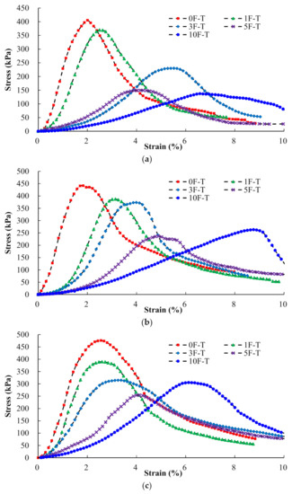 From Figure 4, the failure mode of the sample was a typical shear failure and the shear angle caused by the failure was 35°. Figure 5 shows the stress–strain curve of the FCMS during various F–T cycles and with various fiber content.
