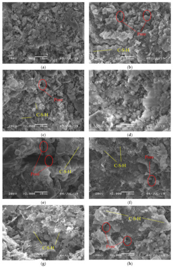 The mechanical properties of a material are affected by its microstructure [5,8]. A scanning electron microscope (SEM) is a common tool used for material microstructure analysis [9]. The influence of F–T cycles on the microstructure of the FCMS is shown in Figure 7 below.