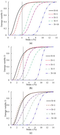 Figure 11 shows the following. (1) The damage variable of the FCMS increases when the strain increases, and a region exists where the damage increases rapidly. With the increase of F–T cycles, the strain corresponding to the initial damage increases, which is primarily due to the transverse cracks in the specimen caused by F–T cycles. When axial pressure is applied, a larger strain is required to close cracks and damage stress is generated in the specimen. (2) Under the same strain conditions, the damage variable value decreases with the increase in the number of F–T cycles. After 0–5 F–T cycles, the increase of fiber causes the damage mean curve to become more concentrated and the damage variable increases when the strain is equal to 4%. After 10 F–T cycles, the pore structure of the sample is widened, and a larger strain is required to damage the sample. This shows that the addition of fiber stabilizes the sample structure and also increases its frost resistance.