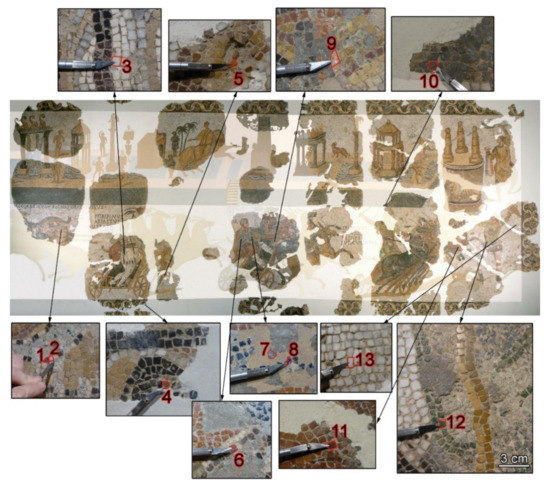 Figure 1. In the center, a general view of the Circus mosaic, and the smaller surrounding images illustrate the zoomed parts to identify the numbered tesserae in their original locations before their extraction.