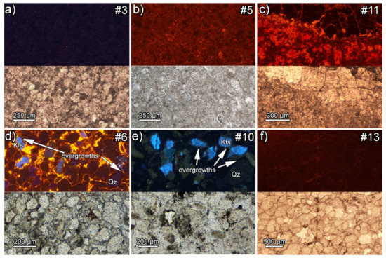 Two tesserae from the Circus mosaic can be classified as siliciclastic fine-grained sandstones, which both contain mostly quartz and more-or-less altered K-feldspar grains (up to ~200 μm diameter) that are apparently angular shaped but they differ in the cement. For tessera #6 (dusky red), the presence of both spar and iron oxide cements (Figure 3a) is obvious. In contrast, for tessera #10 (greenish gray), calcareous components are absent, and the presence of cement is not obvious. Cement is not clearly distinguishable from the grains giving the sandstone a very compact and massive appearance, almost as if it had a granular igneous texture (Figure 3b). Cathodoluminescence measurements (see next section) reveal that both sandstones contain euhedral authigenic overgrowths.