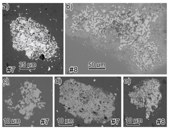 Figure 8. SEM images of Sb-bearing crystal aggregates and clods taken from thin sections of the sampled glass bluish tesserae from the Circus mosaic: (a) Crystal aggregate from tessera #7, also shown in Figure 7a; (b) crystal aggregate from tessera #8, also shown in Figure 7b; (c) smaller crystal aggregate from tessera #7; (d) clod relict from tessera #7, also shown in Figure 7a; (e) smaller crystal aggregate from tessera #8.