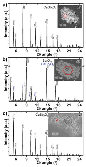 Figure 10. Representative diffractograms obtained by SR tts-μXRD from the crystal aggregates found embedded within glass matrix of the bluish tesserae: (a) CaSb2O6 pattern from an aggregate from tessera #7; (b) pattern showing peaks of Sb2O13 and minor CaSb2O6 from a clod relict from tessera #7; (c) CaSb2O6 pattern from an area of the big aggregate from tessera #8. Corresponding SEM images with indication of the irradiated area (red circle) are also shown.