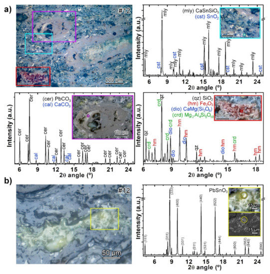 Regarding tessera #12, the ubiquitous crystals with a grayish reflectance were identified as malayaite (CaSnSiO5) and they contained domains of cassiterite (SnO2) (Figure 11a). The very fine crystals with a yellow reflectance are mainly cubic PbSnO3 (Figure 11b), although other cubic similar phases, such as Pb2Sn2O6 and Pb3Sb2O8.47, were also occasionally detected. The precipitates within pores were cerussite (PbCO3) and minor calcite (CaCO3) for those within pores with yellow rims (Figure 11a). In contrast, pores without rims appear to be filled only with calcite. Finally, analyses on the reddish clods reveal a variable mixture of mineral phases always including hematite (Fe2O3), quartz (SiO2), and Mg-bearing silicates such as diopside (MgCaSi2O6) and cordierite (Mg2Al4Si5O18), see Figure 11a.