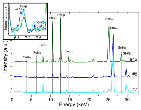 Figure 12. Representative bulk EDXRF patterns for the three sampled glass tesserae from the Circus mosaic showing relevant element peaks. In particular, Sb and Cu for tesserae #7 (arctic blue); Sb for tessera #8 (dark azure); and Pb, Sn, and Cu for tessera #12 (green). Inset, detail to reveal the presence of Co, in #12 and specially in #8.