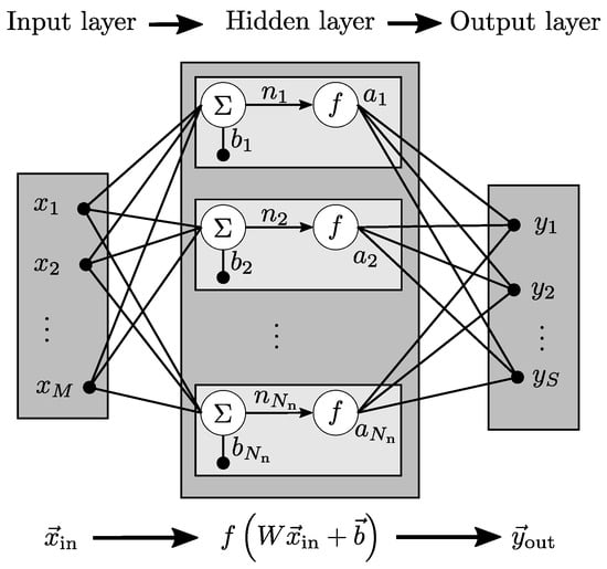 The vector with M predefined parameters forms the input layer. Each parameter transmits a signal to the neurons in the hidden layer. The weighted input signals are summarised with a bias vector ,