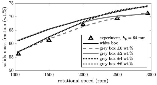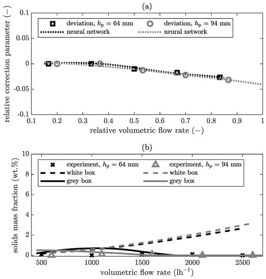 Here again, the upper diagram in Figure 8a demonstrates that the neural network describes the deviation. For both pool depths, the white box model follows the general trend that the solids mass fraction decreases with increasing rotational speed and the two white box models are basically equivalent, as the white box model is not sensitive enough to this difference in the pool depth. A more detailed discussion has been provided in previous publications with validation tests [12,14]. The experimental results reveal that for the same rotational speed, the solids mass fraction is higher at the smaller pool depth. Thus, the separation is better with increasing pool depth. However, the simulation shows no significant difference in the variation of the pool depth. There are several reasons for this. On the one hand, this is due to flow effects, such as the type of the developed flow, the effective pool depth, and the flow path due to the centrifuge geometry. This has an intensified influence if the pool is relatively deep and the centrifuge has a low degree of filling, which means that the volume flowing freely is tendentially larger. Leung et al. [27] assume that a so-called stagnant layer is formed on the surface under which the pool stands. This means that a particle is considered to be separated when it migrates out of the stagnating layer. However, there are contrary opinions in the literature about the conditions under which this stagnant layer is formed. Such flow phenomena affect the residence time behaviour of the particles. For this reason, the assumption of a developed plug flow along the entire pool depth up to the sediment surface for the calculation of the separation efficiency is not valid anymore. In this case, the root mean square error (RMSE) for a pool depth of 54 is reduced from 6 (white box model) to (grey box model). For the pool depth of 64 , the reduction is from to , which is in both cases a significant improvement.