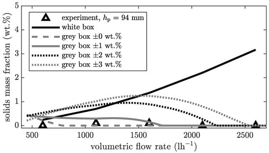 The deviation function demonstrates that the neural network can model the actual deviation for this combination of parameters. For a pool depth of , the deviations are within the range of the trust interval and are therefore not modelled. Thus, the results of the white and grey box model for a pool depth of in Figure 7b are similar. In the case of a pool depth of , small deviations between white box model and experimental data exists which exceed the predefined trust interval. With the deviation function, the neural network describes these discrepancies to correct the white box model. As a result, the grey box model and white box model outputs differ in Figure 7b. Now, the grey box model represents the experimental data better than the white box model. However, the trust interval is defined by the user and depends on the preferences of the user. The measurement error of the experiments can be determined relatively easily in this case, but it is difficult to evaluate the accuracy of the simulation. For the same parameters as in Figure 7, the solids mass fraction in the centrate is displayed in Figure 8.