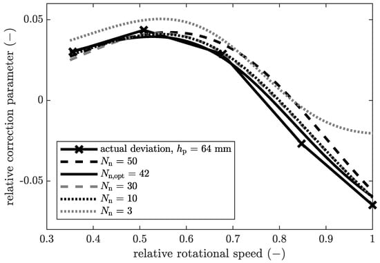 In Figure 9a, the relative correction parameter is plotted over the relative volumetric flow rate for a rotational speed of . In Figure 9b the corresponding result is compared to the experimental value, the result of the pure white box model and the grey box model.