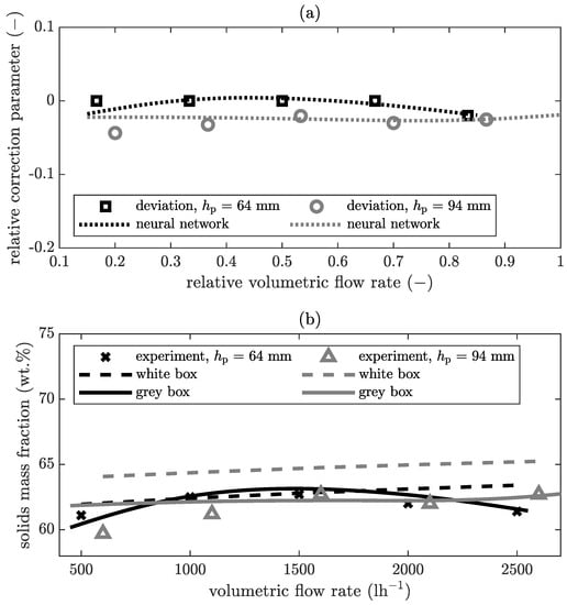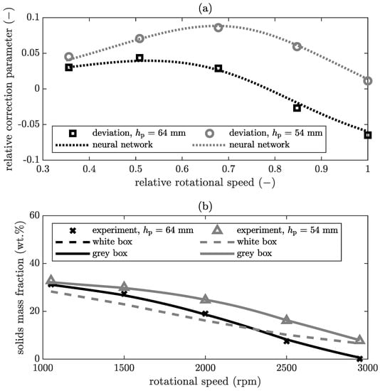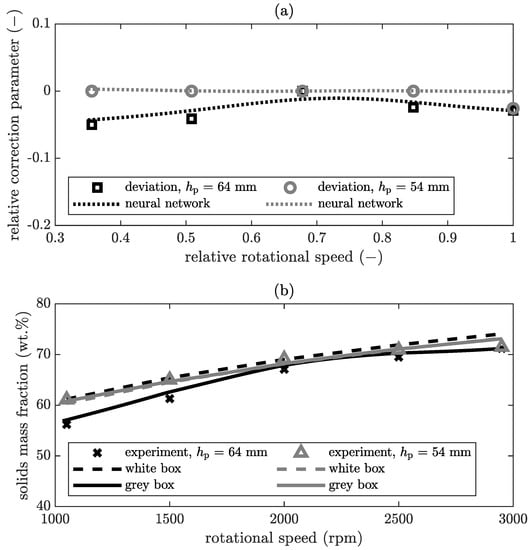In Figure 7a, the relative correction parameter is plotted over the relative rotational speed for the solids mass fraction of the cake. On this basis, the simulation of the white box model is adjusted and results in the grey box model. In Figure 7b the corresponding result is compared between the experimental value, the result of the pure white box model and the grey box model.