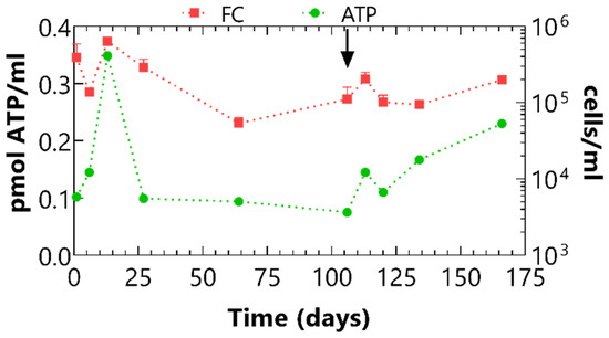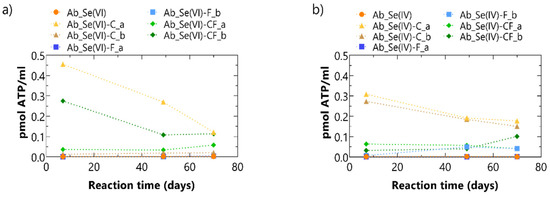 Intracellular ATP concentrations considerably increased in the first six days, and this increase was more pronounced in the presence of Se(IV) (Figure 5). Afterwards, concentrations decreased slightly or remained stable, which is typically observed in batch experiments with borehole clay water [52,53,54]. No intracellular ATP measurements were performed at the end of the batch experiment.