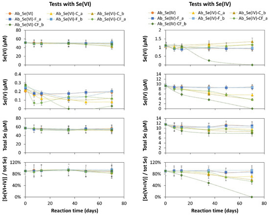 For the biotic batch tests with Se(IV), a fast decrease in the Se(IV) concentration could be observed for the tests with clay (Bio_Se(IV)-C) (Figure 6). This decrease was even enhanced when stainless steel was also present (Bio_Se(IV)-CF). Overall, a decrease rate of 0.1 ± 0.02 µM Se(IV) day−1 and of 0.3 to 0.5 ± 0.05 µM Se(IV) day−1 was observed for tests with clay and with clay and stainless steel filter, respectively, resulting in a complete removal of selenite from the solution. The total selenium concentrations decreased for both test conditions with clay, though for the tests with clay alone, this decrease did not exceed the analytical uncertainty, while a significant decrease was observed for the tests with clay and stainless steel. Note that the total Se concentration in Bio_Se(IV)-CF_a already decreased after 21 days and seemed to re-increase afterwards. This could be tentatively attributed to the fact that the clay sample was not yet disintegrated after 21 days (visual observation), while this was the case at the end of the experiment. Part of the Se species sorbed on the clay was thus detected in the suspension at the end of the test, which was likely not (or less) the case after 21 days. Furthermore, based on the ratio of the total concentration of Se(IV) and Se(VI) to the total Se concentration, the total Se content in tests Bio_Se(IV)-C and Bio_Se(IV)-CF measured at the end of the test was not accounted for by these two dissolved selenium species alone (Figure 3), indicating the formation of other (more reduced) Se species.