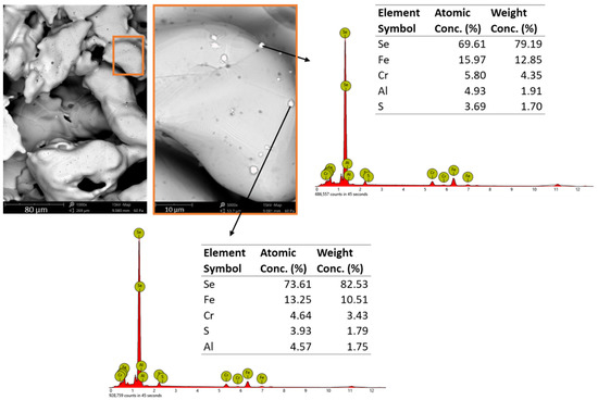 SEM–EDX images of the stainless steel filter surface of batch test Ab_Se(IV)-CF_a. EDX spot analyses were performed on distinct deposits. For EDX analysis, elements Bi, Br, Dy, I, Re, Sb, Sr, Te, Ti, V and W were disabled. The scale bar is shown in the bottom left corner of each SEM image.