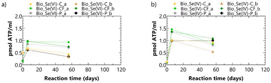 Intracellular ATP measurements for samples in the presence of (a) Se(VI) or (b) Se(IV) during the abiotic test. Details of the test conditions can be found in the legend and in Table 2.