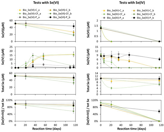 When comparing the concentration of dissolved Se species [Se(VI) + Se(IV)] to the concentration of total Se in the suspensions, only for tests with stainless steel filter and especially for Bio_Se(VI)-CF-b, part of the total Se could not be linked to Se(IV) or Se(VI). Indeed, the total concentration of Se(IV) and Se(VI) to the total Se concentration in suspension was 57% in sample Bio_Se(VI)-CF-b (Figure 6), indicating the formation of other (more reduced) Se species. The significant decrease in this ratio in test Bio_Se(VI)-CF-b coincided with the observed decrease in the concentration of produced selenite after reaching a maximum at day 35 (Figure 6).