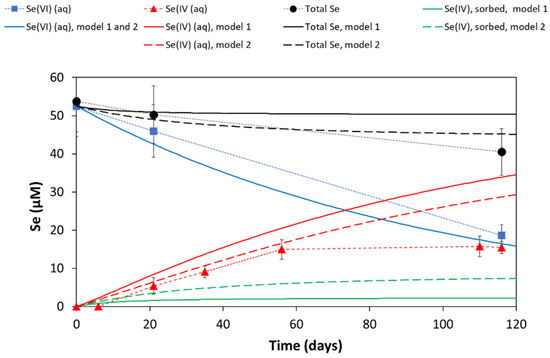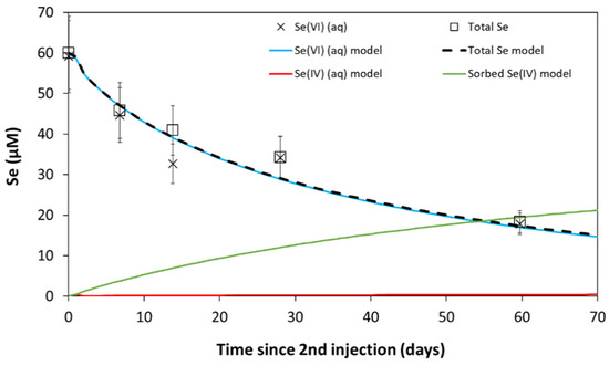Geochemical modeling was undertaken using the geochemical code PHREEQC [46] to aid the interpretation of the experimental data. The modeling considered various processes relevant to the batch and in situ experiments: Se speciation, anion diffusion, Se(VI) reduction kinetics, and Se(IV) sorption. Modeling was focused on the in situ experiment and considered each of these processes in turn to develop a reactive-transport model of increasing complexity. Where relevant, the effect of specific processes was tested against the batch experimental data as detailed below.