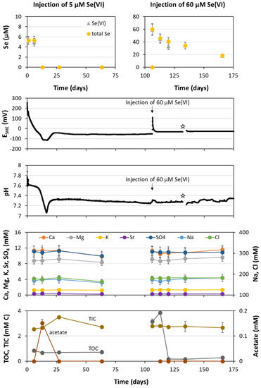 No remaining NO3− and NO2− from previous nitrate injection tests performed to assess the microbial nitrate reduction processes in Interval 3 were found before injection of selenate (cf. former nitrate injections made in the period 2012–2016; see [34,37]). Furthermore, no additional carbon source or electron donor was injected, to assess microbial Se reactivity in the borehole with natural electron donors and carbon sources.