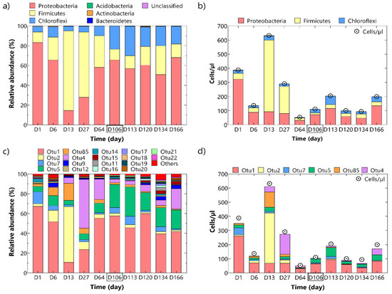 High-throughput amplicon sequencing of the V3–V4 hypervariable region of the 16S rRNA gene was performed with the Illumina® MiSeq platform according to the manufacturer’s guidelines at BaseClear B.V (Leiden, The Netherlands). DNA sequencing data were processed using the OCToPUS pipeline (Optimized CATCh, Mothur, IPED, UPARSE, and SPAdes) [41], which consists of the following steps: quality filtering using the Hammer algorithm implemented in the SPAdes tool [42], merging reads using the make.contigs command from the open source software package Mothur (version 1.39.1), alignment and filtering of the merged reads following the standard operating procedure as described by the authors of the Mothur software (version 1.39.1), error correction using IPED [43], chimera identification using CATCh [44], and OTU (operational taxonomic unit) clustering using UPARSE (version 7.0) with a 97% cut-off [45]. Subsampling was performed based on the lowest number of reads obtained over the ten different samples, i.e., a coverage of 29,061 reads. Rarefaction curves indicated that this level of subsampling adequately represented the bacterial diversity in the samples (Figure S1, Supplementary Materials). The datasets generated and analyzed during the current study are available in the NCBI Sequence Read Archive (SRA) repository (PRJNA717984).