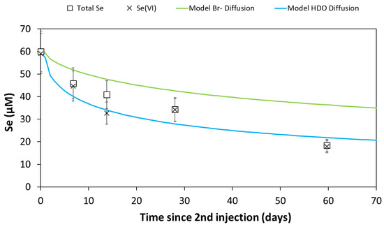 The PHREEQC model shows that the evolution of the selenate and total Se concentration can indeed be fitted well when considering both diffusion of Se(VI) (using the pore diffusion coefficient (Dp) obtained for Br−) in combination with a reduction of Se(VI), using a reaction rate constant, which was the same for the in situ test and the biotic batch tests. This indicates that the biotic batch tests provided a good laboratory model of the ongoing in situ processes.