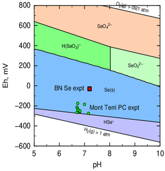 In several countries relying on nuclear energy, deep clay formations are studied as potential host rocks for geological disposal of intermediate-level and high-level long-lived waste (ILW and HLW). For both types of waste (mainly vitrified HLW and nitrate-bearing bituminized waste), 79Se (T½ = 327 ka [1]) is considered as one of the main radionuclides contributing to the dose-to-man after final disposal [2,3,4,5]. As selenium is a redox sensitive element, it can exist under different oxidation states depending on the environmental conditions: mainly Se(VI), Se(IV), Se(0), Se(-I), and Se(-II). Due to the oxidizing conditions during spent fuel reprocessing, radiolysis in the waste and/or due to the presence of large amounts of nitrate in nitrate-bearing bituminized ILW, Se is expected to be released—at least in part—as Se oxyanions [3,6]. Although part of these oxyanions could sorb onto corrosion products present on the steel canisters or steel rebars [7], the remainder is expected to reach the clay host rock surrounding the waste repository.