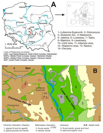 (A) Limits of Pleistocene ice-sheets (upon [69,70]) study site (1) and other research sites cited in the discussion: 2–9—[40]; 10—[32,33], 11—[39], 12—[71,72], 13—[42], 14—[41]. (B) The location of the tested walls (A and B, in red) in the gravel pit in Łubienica-Superunki against the surface deposits within a fragment of the Detailed Geological Map of Poland (DGMP), 1:50,000 scale, Serock sheet (No. 450). Source: Polish Geological Institute, Institute-National Research Institute, Warsaw, https://geolog.pgi.gov.pl (accessed on: 18 December 2020). The location of the area against the background of the ice-sheet limit of the Wartanian Glaciation and its previously distinguished stadials is shown in (A).