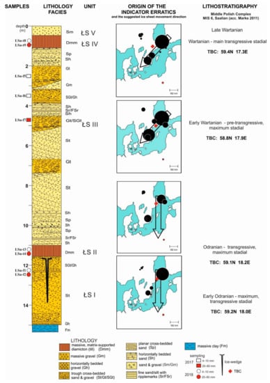 Two till layers (unit ŁS II and unit ŁS IV) and two glaciofluvial layers (unit ŁS I and ŁS III; Table 1; Figure 2, Figure 3 and Figure 4) were sampled in 2017 [49] and 2018, according to the method of sampling coarse gravel (20–60 mm) in [5,10,84] and medium gravel (4–10 mm) deposits for petrographic analyses in [85,86,87,88,89,90].