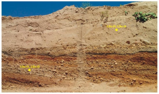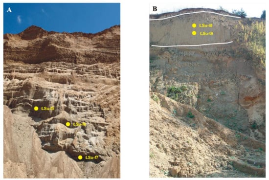 The Łubienica-Superunki gravel pit exposes thick (up to 15 m) glaciofluvial sands and sandy gravels, and thin (up to 1 m) glacial tills (Figure 2). The features of the glaciofluvial sediments are discussed in the papers by Giriat et al. [73] and Smolska et al. [74]. The study covered two (A and B in Figure 1B) pit walls of the Łubienica-Superunki gravel pit in its southern part.