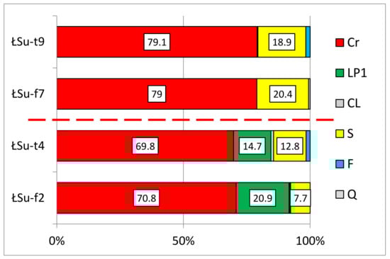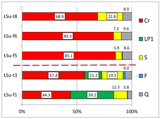 The petrographic analysis of medium gravel sediments (4–10 mm) showed that crystalline rocks (Cr) are the most prevalent petrographic type in all samples, regardless of the sediment facies type (Figure 5). The higher percentage of these rocks in the glaciofluvial deposits (unit ŁS III: samples ŁSu-f5 and ŁSu-f6) and glacial till (unit ŁS IV: sample ŁSu-t8) results from the lack of Lower Palaeozoic limestones (LP1) in both these layers.