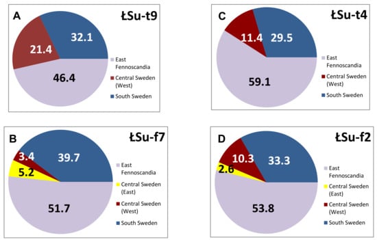 The TBC erratics of the upper levels are quite spaced apart (i.e., about 75 km along a straight line). The shift of ŁSU-t9 (from glacial till) to the northwest is the result of a large number of erratics from Dalarna (central Sweden), and the southernmost location (compared to the other three samples) of ŁSu-f7 (from glaciofluvial deposits) is the result of the largest number of erratics from SE Sweden, from Småland, in that sample.