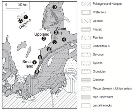 Location of the outcrops of indicator erratics, identified in the Łubienica-Superunki gravel pit, and symbolic location of the outcrops of erratics of limited indicative significance. Symbols of indicator erratics: 1—Bredvad porphyry, 2—Uppsala granite, 3—Åland quartz porphyry, 4—red Baltic porphyry, 5—brown Baltic porphyry, 6—Västervik porphyrite, 7—Småland granite, 8—Kalmar and Tessini sandstones. Symbols of erratics of limited indicative significance: A—Dalarna sandstone, B—Jotnian sandstone.