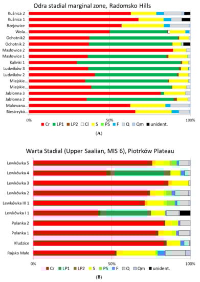 Percentages of the petrographical groups of the glaciofluvial gravels within the marginal zone (A) correlated with the Odra Stadial, and its hinterland (B) correlated with the Warta Stadial (Upper Saalian, MIS 6). Source: Górska-Zabielska and Wachecka-Kotkowska [37]. Symbols explanation: Cr—crystalline, LP1—grey Lower Palaeozoic limestones, LP2—red Lower Palaeozoic limestones, Cl—Cretaceous limestones, S—sandstones, PS—Palaeozoic shales, F—flints, Q—quartz, Qm—milk quartz, unident—unidentified.