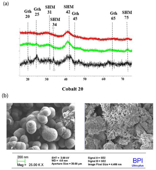 (a) X-Ray diffractograms of Biogenic synthesis SHM (SorbB, red), Oxidative synthesis SHM (SorbS, green) and High-pressure compaction SHM (SorbP, black); (b) SHM images for SorbS (left) and SorbP (right).