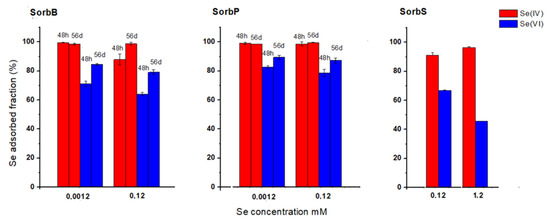 There was a clear preference of all SHM specimen for adsorption of Se(IV) in single-species experiments (presence of either Se(IV) or Se(VI), Figure 2). In the case of SorbB and SorbP, Se(IV) was almost completely (average 97%) adsorbed irrespective of the initial Se concentration (0.0012 or 0.12 mM) and reaction time (48 h or 56 d). In contrast, the adsorbed fraction of Se(VI) achieved only values between 64% and 82% after 48 h; the values increased after 56 d to 79% and 89%. In the case of SorbS, the adsorbed fraction at an initial Se concentration of 0.12 mM was slightly lower and had an average of 91% and 67% for Se(IV) and Se(VI), respectively. At an initial Se concentration of 1.2 mM, the adsorption rate of Se(IV) was still 96%, while it decreased for Se(VI) to 45%. The difference observed between SHM specimens in the Se sorption are probably due to the difference in synthetic methods and in SHM particle sizes.