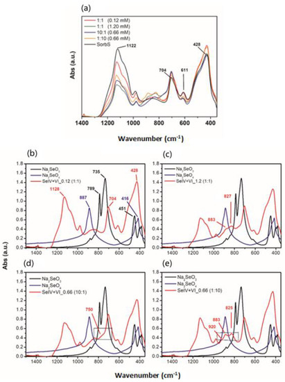 A gradual appearance of a triple splitting can be observed between 800 and 920 cm−1 (Figure 3b–e), particularly when both Se oxyanions are equimolar at high concentration (Figure 3c, ~827 and 883 cm−1) and when Se(VI) is the dominant species (Figure 3e, ~825, 883 and 920 cm−1). Similarly, Su and Suarez [33] observed triplet splitting of the ν3 band at 824, 891 and 916 cm−1 when increasing amounts of Se(VI) adsorbed onto amorphous iron oxide which they attributed to the formation of a bidentate bridging complex of Se(VI) at the surface. In contrast, when both Se oxyanions are equimolar at high concentration or when Se(IV) is the dominant species (Figure 3c,d), a new vibration signal appeared at ~750 cm−1 which can be attributed to the ν3 vibration of selenite [33,34].