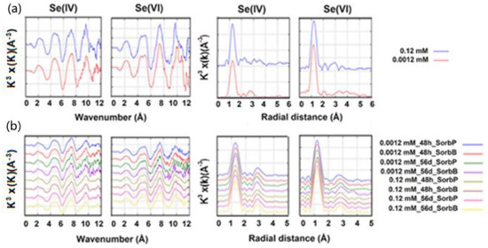 Normalized k3-weighted Se K-edge EXAFS spectra (left) and RSF profiles of EXAFS spectra (right) of Se(IV) and Se(VI) adsorbed onto (a) SorbS (1 g/L) at initial Se concentration of 0.12 and 1.2 mM after 48 h, and (b) SorbB and SorbP (1 g/L) at initial Se concentration of 0.0012 and 0.12 mM after 48 h and 56 d at pH 3.