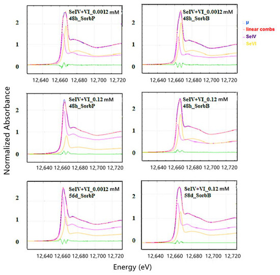 Competitive sorption did not alter the valence state of both Se(IV) and Se(VI) as indicated by the unchanged position of the absorption edges. Se K-edge XANES spectra display more or less similar white line (WL) intensity of Se(VI) and of Se(VI) at all equimolar total Se concentrations after 48 h for all SHM specimen (Figure 5). When one species was added in excess over the other in experiments with SorbS, the WL intensity of the high-concentration species clearly became predominant (Figure 6).