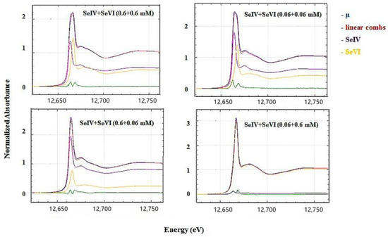 Selenium K-edge (12,658 eV) X-ray absorption near-edge structure (XANES) and extended X-ray absorption fine-structure spectra were collected at the Hard X-ray MicroAnalysis (HXMA) Beamline at the Canadian Light Source (Saskatoon, Canada). The XANES data were analysed using Artemis software. The theoretical calculation for EXAFS phases scattering and amplitudes and were performed by using the software FEFF 7.02 [25,26]. The EXAFS data reduction, Linear combination fitting and the following R space curve fitting were performed using Athena software [26] and WinXAS [27], respectively. Details of the Se K-edge XAS analyses are provided in the Supplementary Materials.