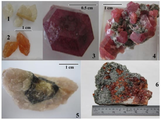 The six samples used in this study are shown in Figure 2. Sample-1 is from Lytton, BC, Canada (ROM # M30122) and is white in colour. Sample-1 was selected because it was described as “white jade”, which is similar to “green jade” from South Africa [37]. Sample-2 is from Tanzania and is an orange-brown “hessonite” grossular. Sample-3 is from Sierra de Cruces, Coahuila, Mexico and is a raspberry-red grossular that occurs on the eastern slope of the Sierra de Cruces Range, which overlooks Lake Jaco [2,43]. Sample-4 is from Chihuahua, Mexico and is deep-pink in colour. Sample-5 is also from Chihuahua, Mexico and contains a yellow core of grossular and very thick white outer layer of grossular. The core and the outer layer are separated by a dark layer of andradite. Fragments of grossular from the outer layer and the yellow core is used in this study. Sample-6 is from Bellecombe, Aosta Valley, Piedmont, Italy, and consists of red euhedral grossular crystals. The geology of this area was described by Ferrando et al. [44]. They reported the evolution of a polyphase rodingite that occurs within the Bellecombe antigorite–serpentinite and exposed in the Piemonte zone of Aosta Valley, NW Italy. Fine-grained rodingitic rocks are cross-cut by a network of veins that contain different types of grossular–andradite garnets, chlorite, diopside, and vesuvianite. The metamorphic rocks of the late greenschist facies were formed at p = 0.22 GPa and T = 400 °C [44].