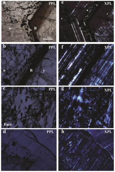 Thin-section images for sample-5 from Chihuahua, Mexico: (a–d) are plane-polarized light (PPL) and (e–h) are the corresponding cross-polarized light (XPL) images. In (a,b), the white rim of the crystal is indicated by w, the yellow core is indicated by y, and the northeast diagonal band is the boundary (B) between w and y. Image (h) contains chevron features. Images (e,f) contain lamellar features, which may represent different phases. A euhedral face of the crystal (c,h) shows some mottling features. Important crystal features are only observed along special directions. The scale bar for all the images are shown in (a) and represents 1 mm.