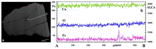 Backscattered electron (BSE) image (a) for a birefringent grossular sample-3 from Coahuila, Mexico, that corresponds to that in Figure 3a,b. This sample-3 contains two phases that have different contrast. The light bands and lines are parallel to the right edge of the crystal. A line scan along the line A to B in (a) is displayed in (b) and shows the inverse compositional variations in Al3+ and Fe3+ cations, whereas the Ca content is constant. The scale bar in (a) represents 100 μm. The line scan units are arbitrary.