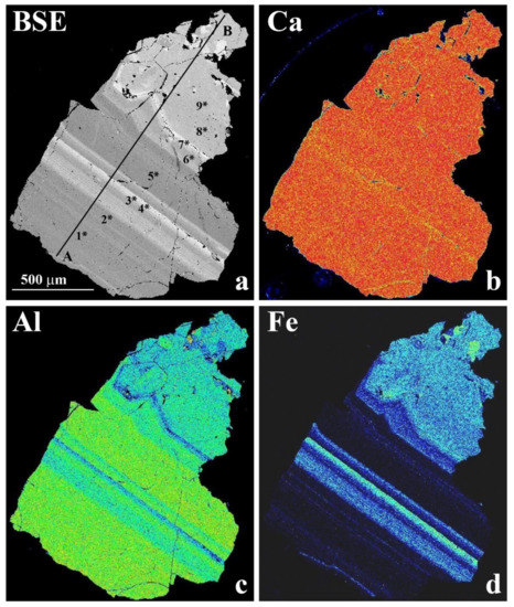 - Ivanova, T.I.; Shtukenberg, A.G.; Punin, Y.O.; Frank-Kamenetskaya, O.V.; Sokolov, P.B. On the complex zonality in grandite garnets and implications. Mineral. Mag. 1998, 62, 857–868. [Google Scholar] [CrossRef]