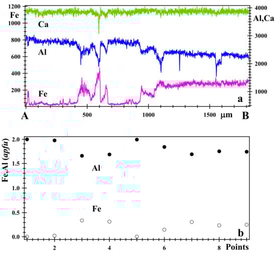 Sample-4 from Chihuahua, Mexico clearly shows two separate phases with sharp contact boundaries (Figure 6). Line scans and cation content across the separate phases that occur as lamellar features (Figure 7a,b) show that the Al3+ and Fe3+ cations are inversely correlated. The elemental maps for sample-4 clearly indicate two separate phases that contain different amounts of Al3+ and Fe3+ cations (Figure 6b–d), whereas Ca atoms are distributed homogeneously throughout the crystal (Figure 6b). Chemical analyses from specific points (points 1 to 9 shown in Figure 6a and Figure 7b) indicate the composition of the different phases. The compositions that represent phase-4a and phase-4b are given in Table 1.